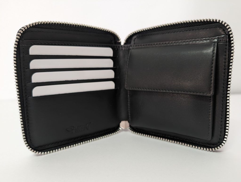 Esta es la cartera de piel ideal. Esta lujosa cartera con cremallera tiene también 4 huecos para tarjetas de crédito, un bolsillo grande y plano para billetes y otro con cierre de corchete para las monedas. Cierre seguro con cremallera.